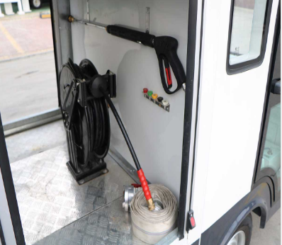 2.前有兩個可旋轉(zhuǎn)、高度可調(diào)的高壓噴頭,下方有一排噴淋頭,駕駛室內(nèi)操作,可自動實現(xiàn)對路面及路牙聚積的污泥清除、狹窄道路灑水等;