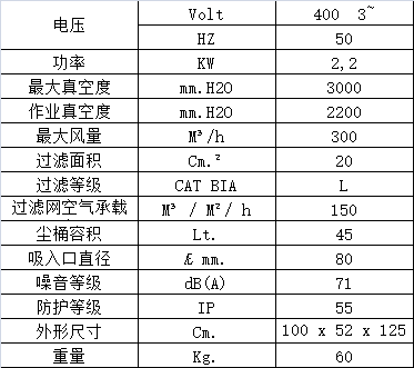 下拉式塵桶,容量45升,底部裝有車輪,人性化的塵桶控制把手使得處理桶內所集物料非常安全方便。也可以根據具體需要使用塑料袋直接集塵。鋼制底盤堅固耐用,底部裝有2個旋轉輪,其中一個帶剎車;所有金屬件均經過環氧漆表面處理。